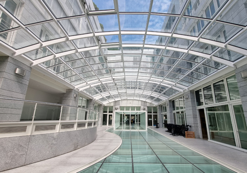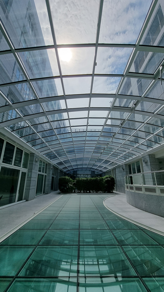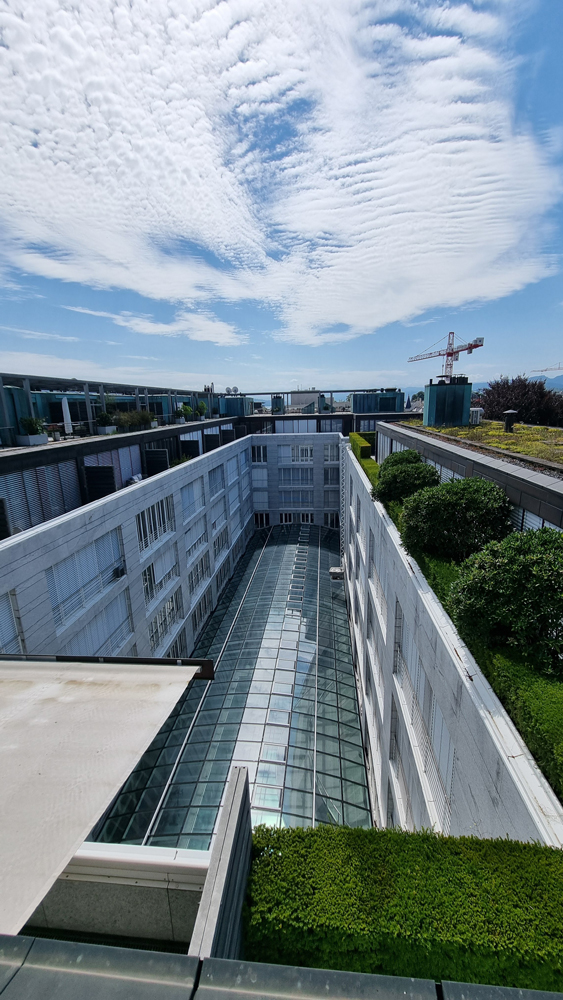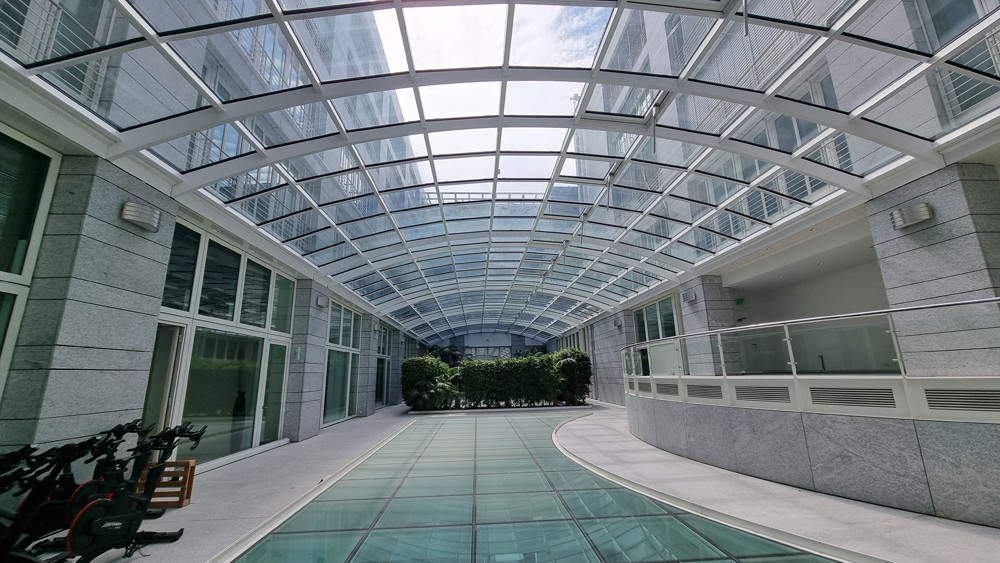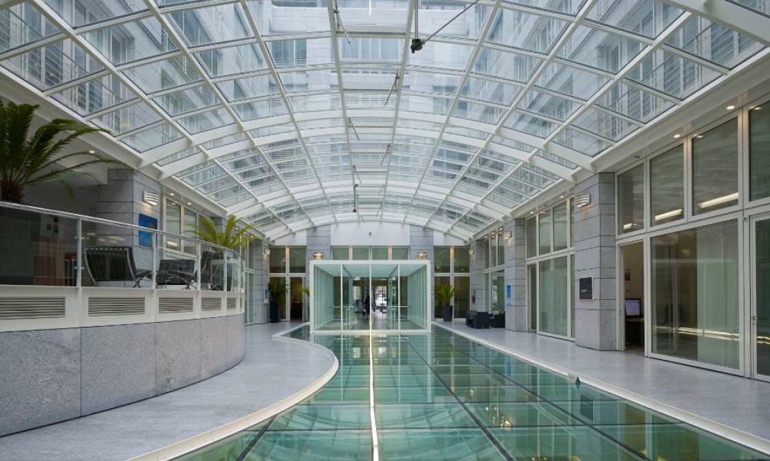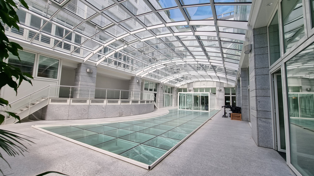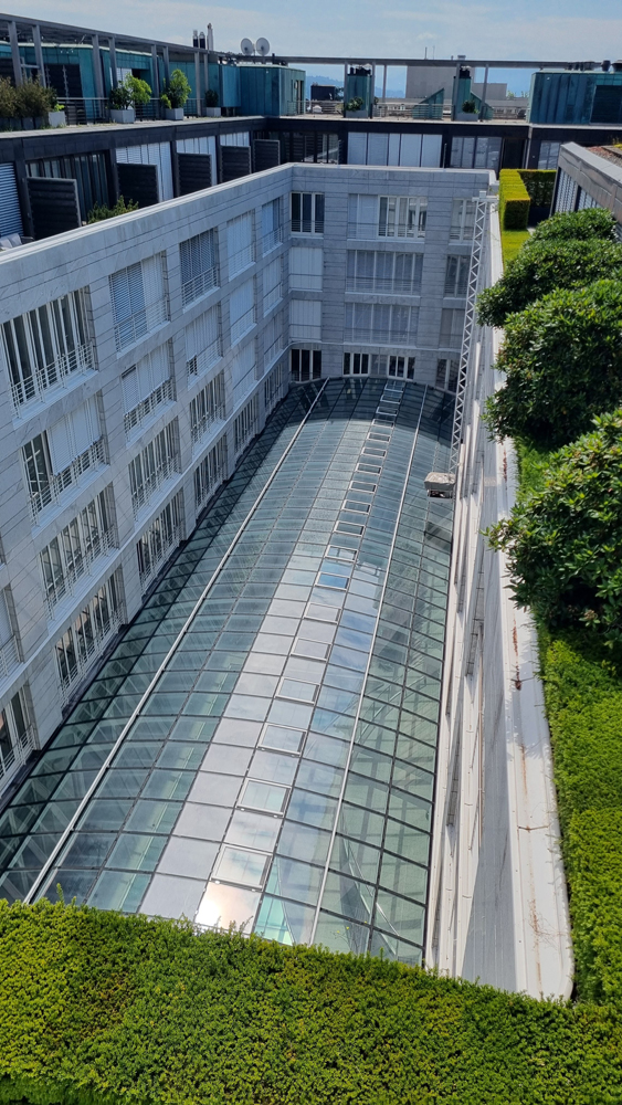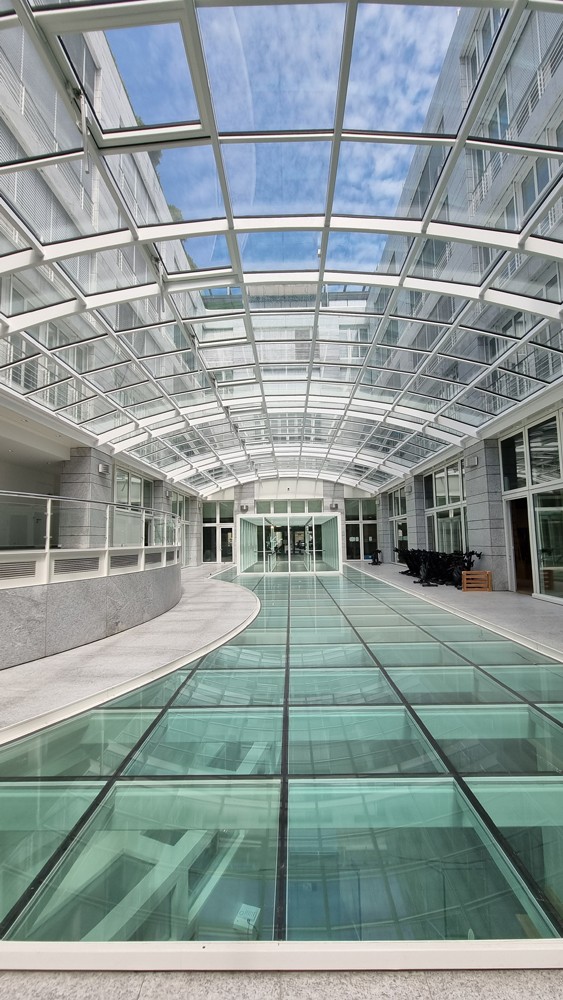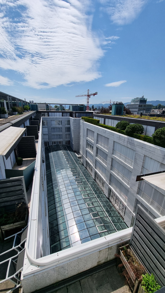 Als Gesamtleister (TU-Vertrag) sanieren wir in einer ersten Etappe das Glasdach über dem Atrium. Das alte Glasdach wird etappenweise zurückgebaut. Die bestehende Stahl-Grundkonstruktion wird saniert und verstärkt. Das neue Dach wird mit Aluminium-Pfosten-Riegelprofilen aus dem System Raico THERM+ 76 erstellt. Dazu kommen 22 Aluminium RWA-Flügel ebenfalls aus dem System Raico. Die 690m² Verglasung wird aus einem 3-fach Isolierglas (VSG, Float und ESG-H) mit einem U-Wert von 0.6W/m²K und einem g-Wert von 51% bestehen.