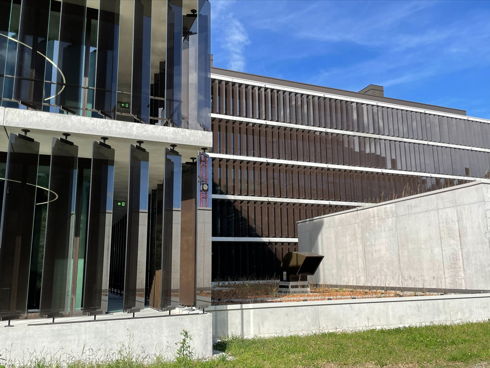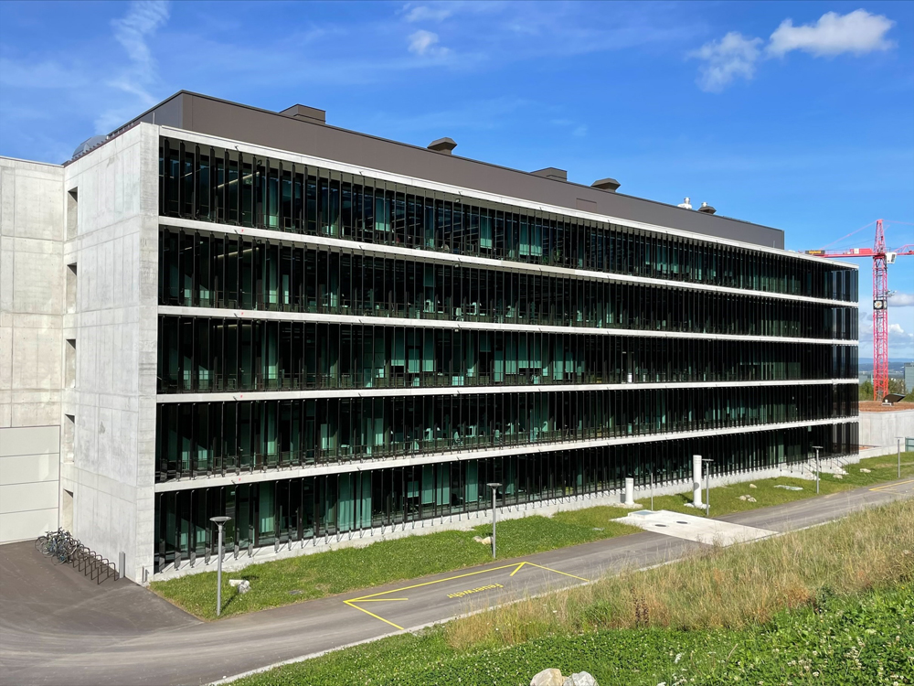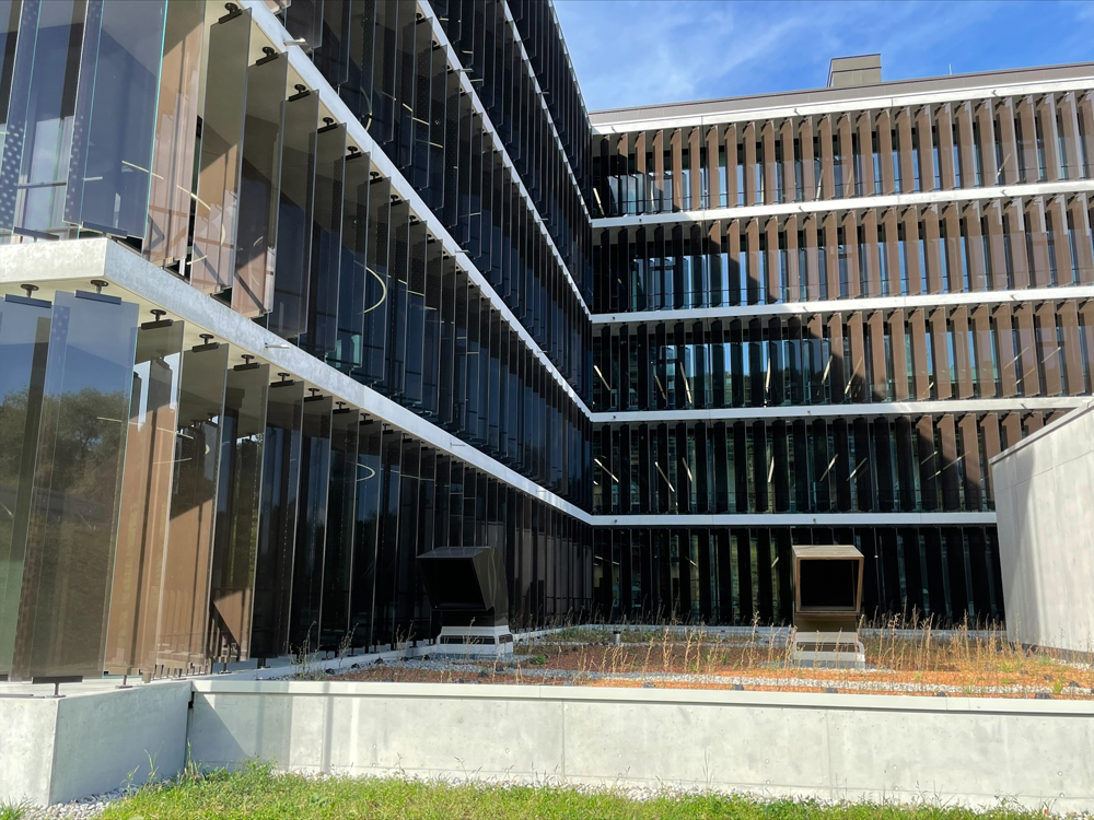 Als Fassadenbeschattung wurden vertikale Glaslamellen bestehend aus 2 x 12mm TVG (Weissglas) mit einseitigem Punkt-Siebdruck und einer 4-fach PVB Folie verbaut. Alle Glaslamellen wurden mit einer Breite von 700 mm und einer Höhe von 3360 -3485 mm hergestellt.