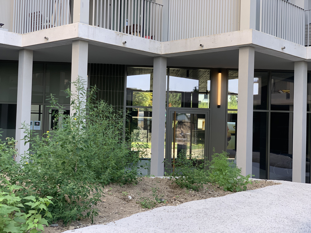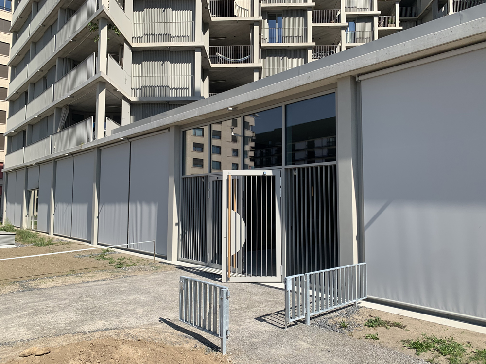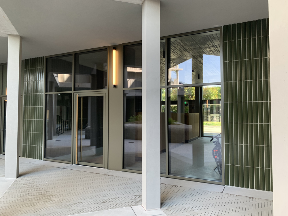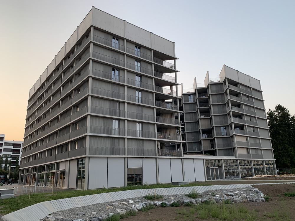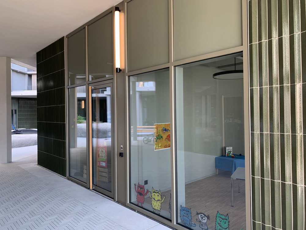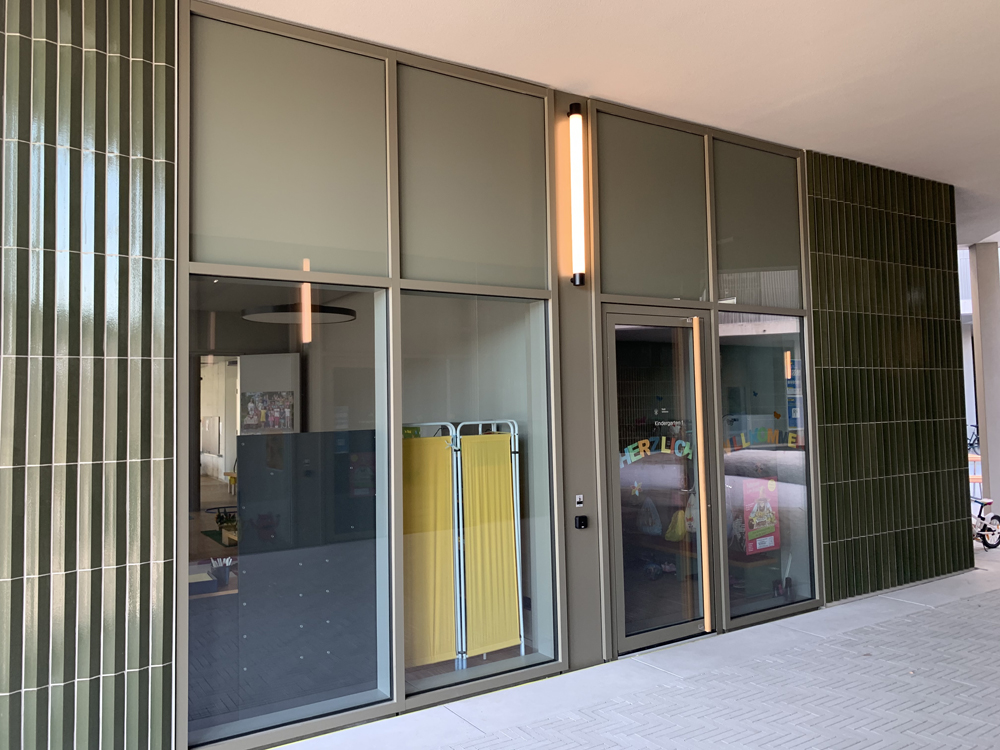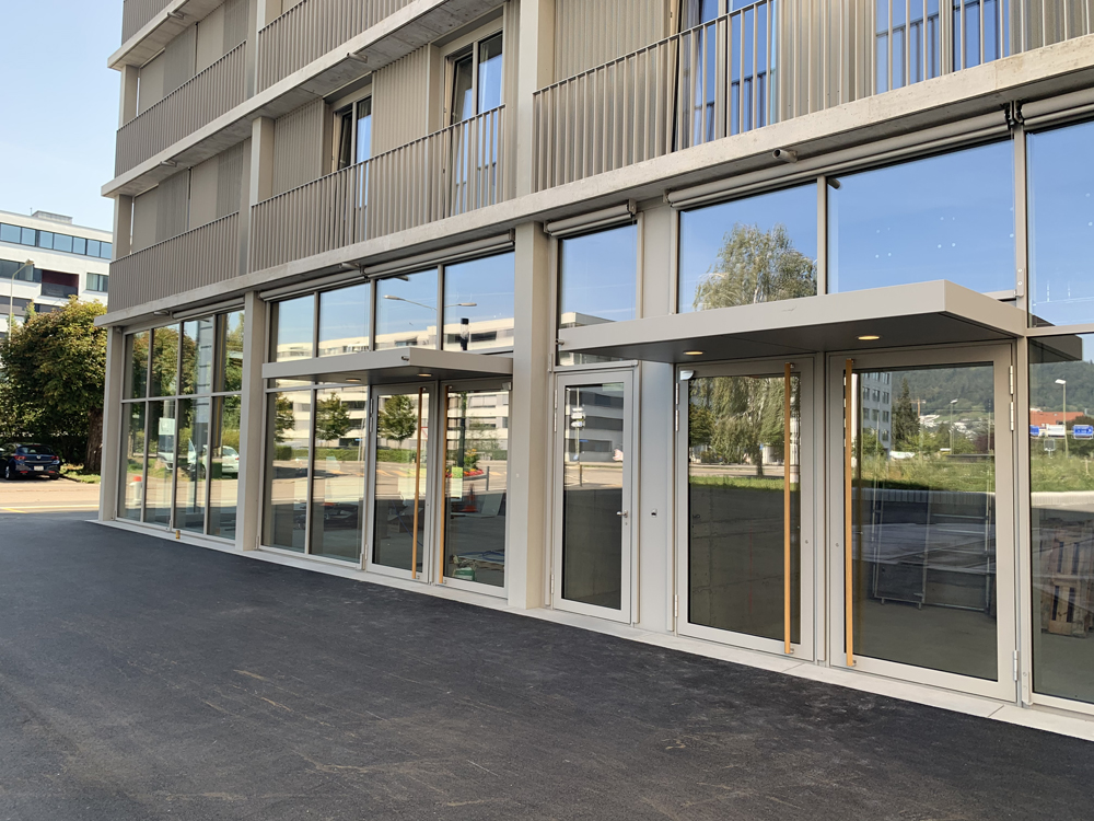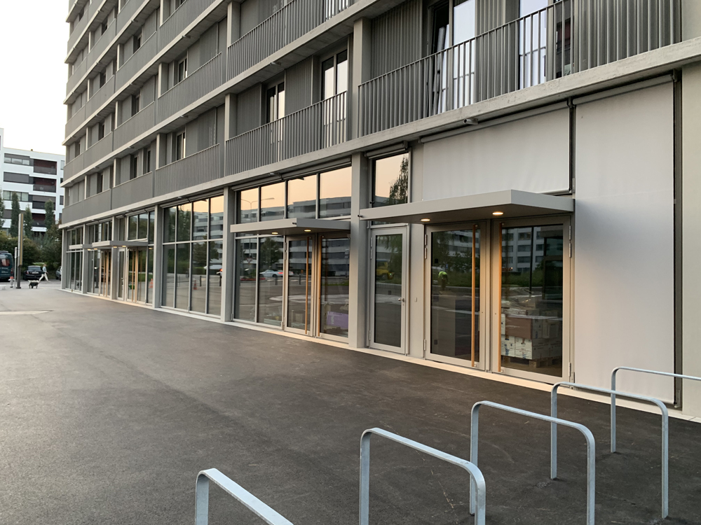 Gebäude B4, Fassade im Erdgeschoss ringsum inkl. Innenhof Pfostenriegel-Konstruktion aus Aluminium System RAICO THERM+ A-V 56 mit Einsatzelementen. Türen zu Treppenhäusern, Wohnungen und Gewerberäumen. Total 38 Türen im EG und 15 Türen im DG, Türsystem aus wärmegedämmtem Aluminium Raico FRAME 75 Di. Innenhoffassade und Fassadenseite Süd / Ost (Opake Fassadenelemente) einige Glasfelder lackiert resp. emailliert in Fassadefarbe graugrün und hellgrau.