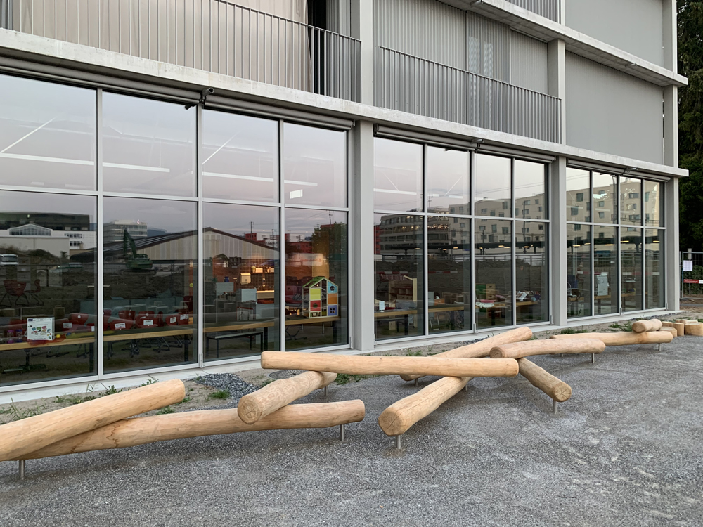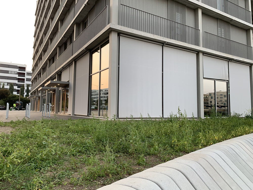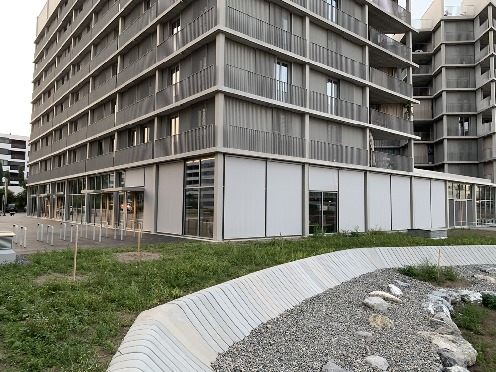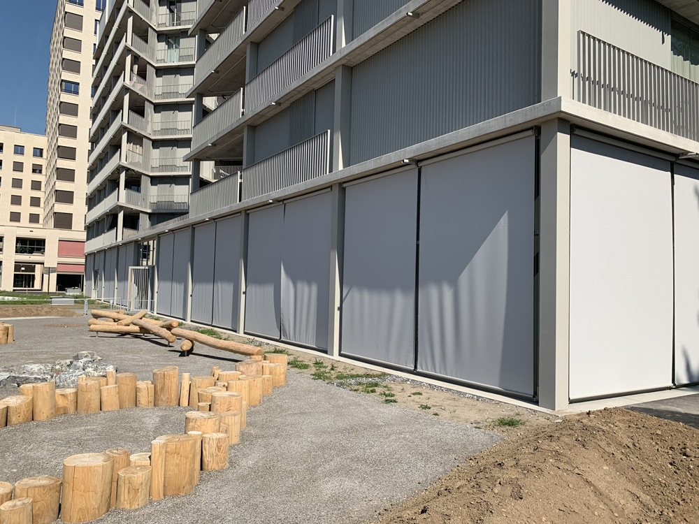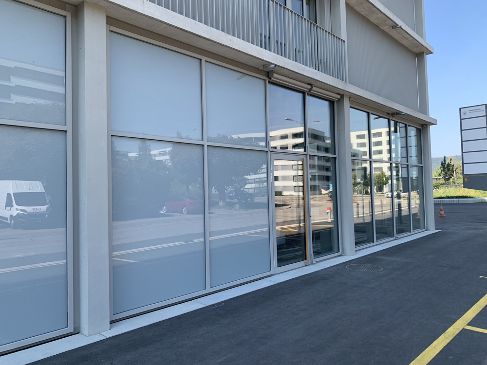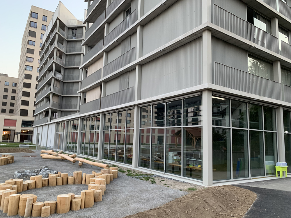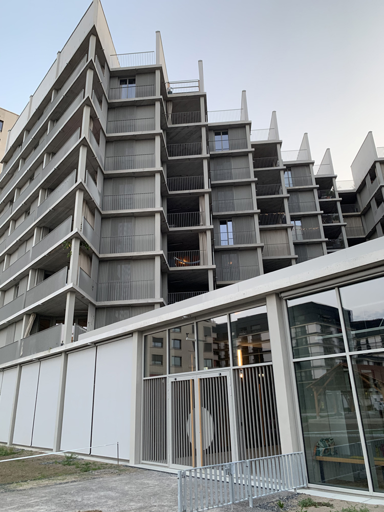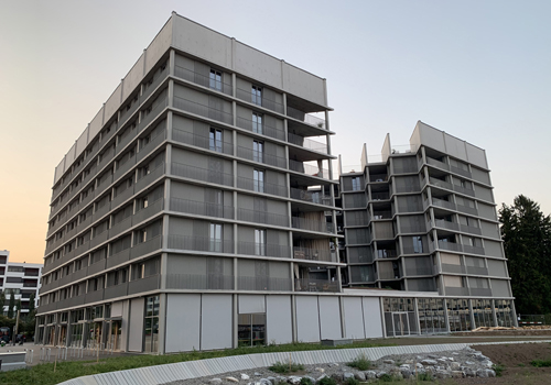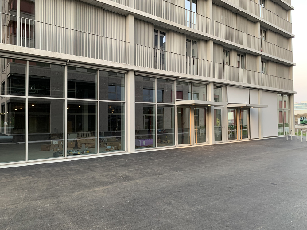 Gebäude B4, Fassade im Erdgeschoss ringsum inkl. Innenhof Pfostenriegel-Konstruktion aus Aluminium System RAICO THERM+ A-V 56 mit Einsatzelementen. Türen zu Treppenhäusern, Wohnungen und Gewerberäumen. Total 38 Türen im EG und 15 Türen im DG, Türsystem aus wärmegedämmtem Aluminium Raico FRAME 75 Di. Innenhoffassade und Fassadenseite Süd / Ost (Opake Fassadenelemente) einige Glasfelder lackiert resp. emailliert in Fassadefarbe graugrün und hellgrau.