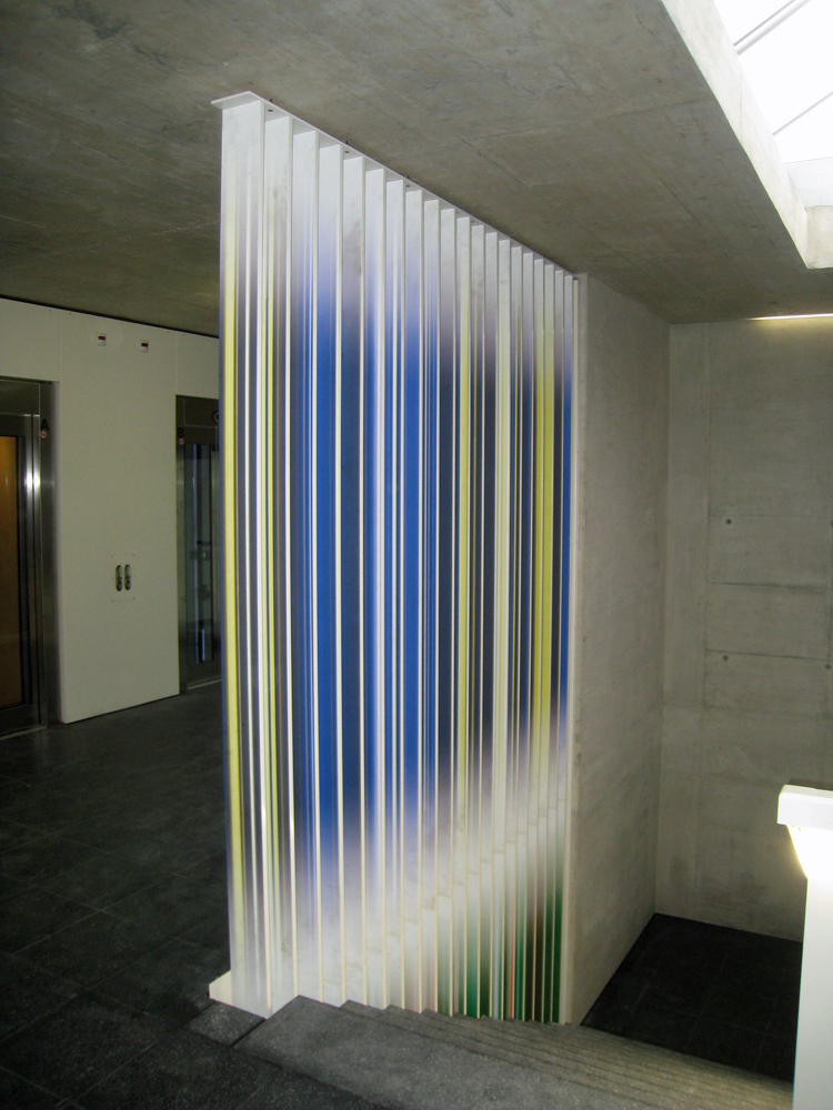 Pfosten-Riegelkonstruktion System Schüco FW60+. Vorgehängte Brüstungsgläser mit speziellen Siebdruckverlauf mittels SGG-Verklebung an spezieller Unterkontruktion gehalten. Tür Einsatzelemente System Schüco ADS HD 70 und Fenster Einsatzelemente System Schüco AWD 75 BS.HI. Lackierte Aluminium-Verkleidungen sind pulverbeschichtet in HWF (hochwetterfester) Ausführung.